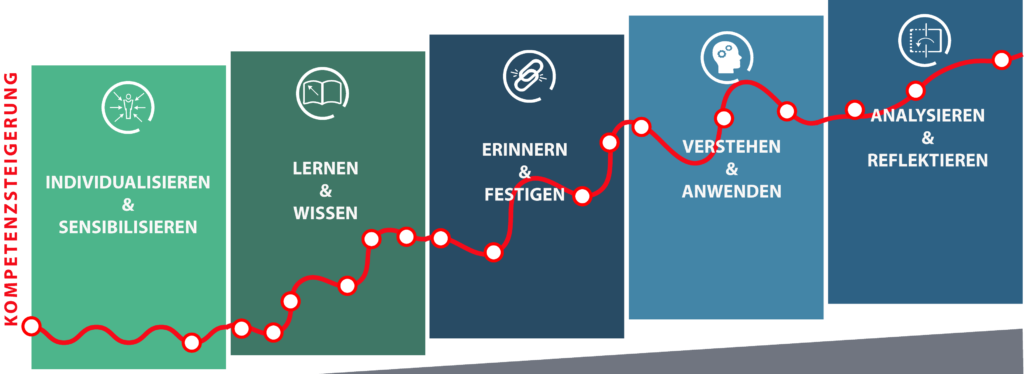 Nach der Individualisierung erfolgt eine Phase des Lernens, die in Wissen endet; dieses wird im nächsten Schritt gefestigt. In der darauf folgenden Stufe geht es darum, das Gelernte zu verstehen und anzuwenden – um es schlussendlich analysieren zu können, und zu reflektieren. Somit ermöglichen wir nachhaltiges Lernen.